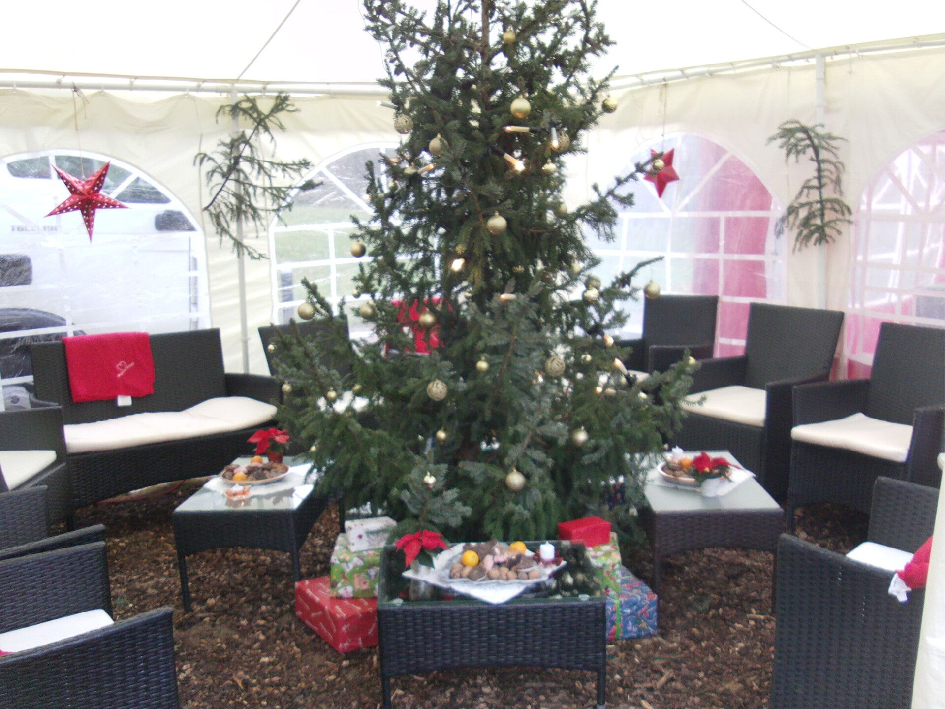 Bei einem Firmen-Weihnachtsmarkt ab 50 Gästen ist ein 12 x 6m großes Festzelt, ausgestattet mit bequemen Gartenmöbeln aus Polyrattan, 2 Heizstrahlern, einem festlich geschmückten Weihnachtsbaum in der Mitte und weihnachtliche Dekoration im Preis enthalten.