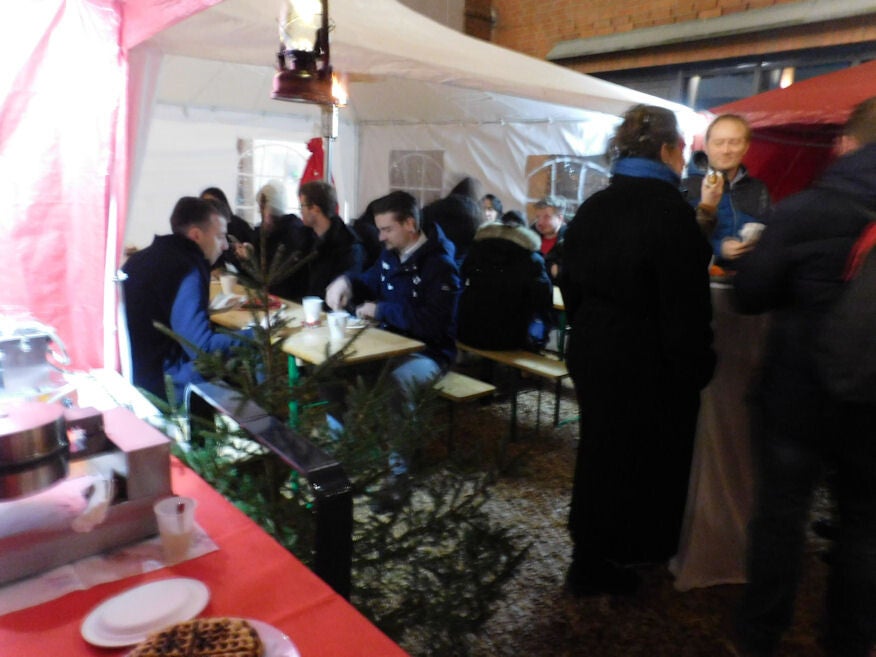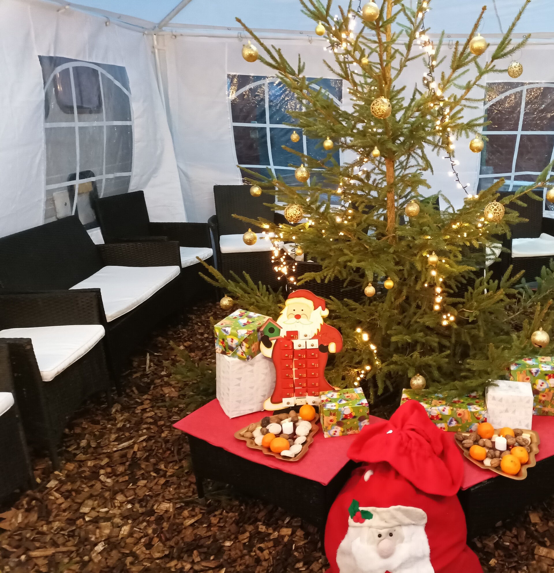 Bei einem Firmen-Weihnachtsmarkt bis zu 50 Gästen ist ein 4 x 4m großes Festzelt, ausgestattet mit Bierzeltgarnituren, Heizstrahler und weihnachtlicher Dekoration im Preis enthalten.